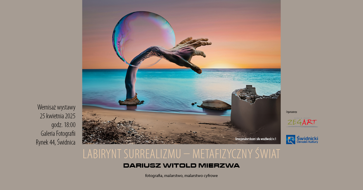 Wystawa Labirynt Surrealizmu – Metafizyczny Świat to zaproszenie do kontemplacji i podróży po przestrzeni, w której granice rzeczywistości i snu zacierają się, w metafizycznym tańcu. Dariusz Mierzwa kreuje tu wizje pełne symboliki, ukazujące wrażliwość ludzkiej duszy, jej pragnienia, lęki i marzenia. Jego prace przenoszą odbiorcę w świat, gdzie czas ulega deformacji, a pamięć rozkwita niczym kalejdoskop wspomnień.